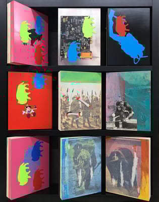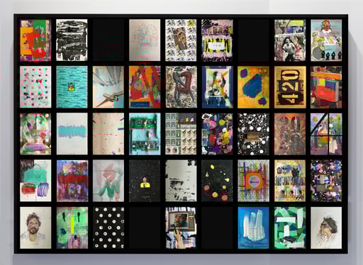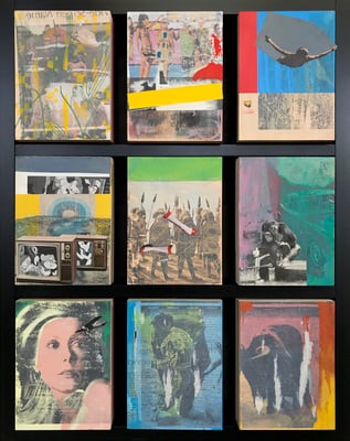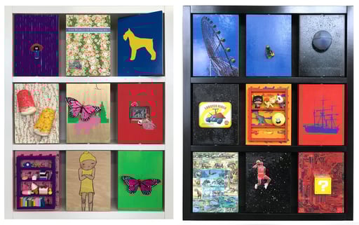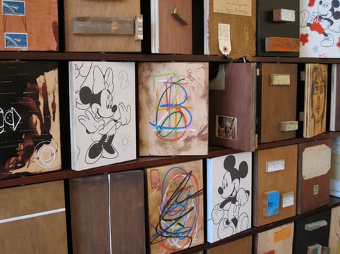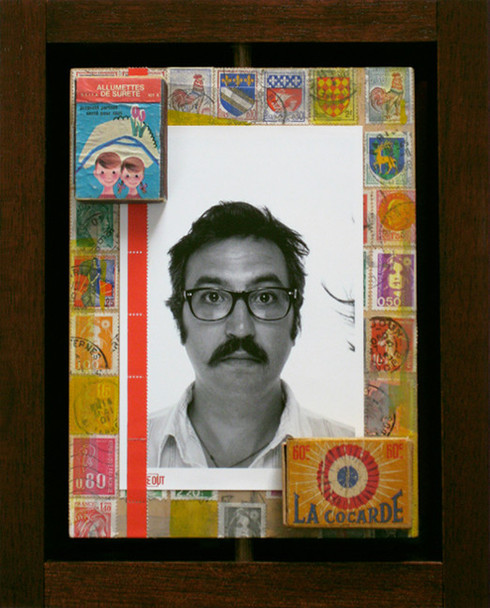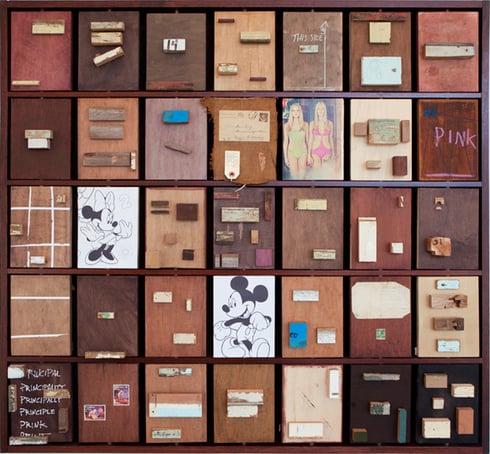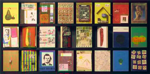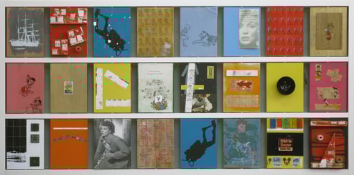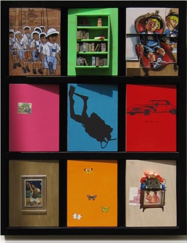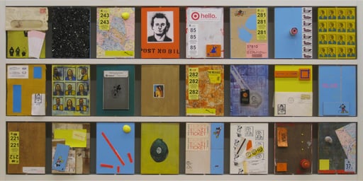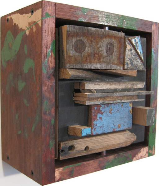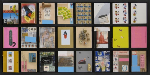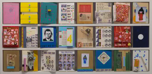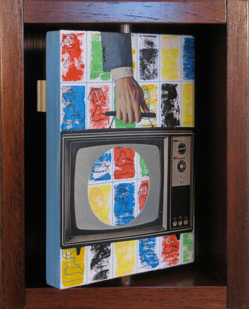 Described as a Cabinet of Curiosities, each work in the Rotating Constructions series contains several unique collages, on double-sided wood blocks that spin by hand, allowing the viewer to interact. Each collage includes original paintings, postage, magazines, and found objects collected from daily life and travels.